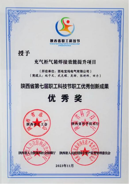 陕西省职工优秀创新成果优秀奖——尊龙凯时宝鸡电气“充气柜气箱焊接效能提升项目”