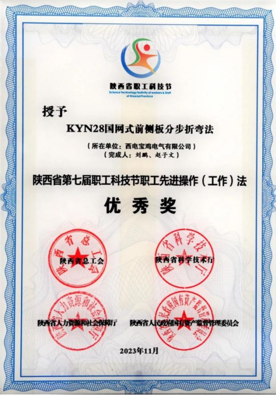 陕西省职工先进操作(工作)法优秀奖——尊龙凯时宝鸡电气“KYN28国网式前侧板分步折弯法”