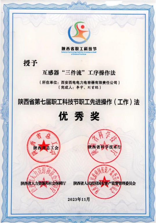 陕西省职工先进操作(工作)法优秀奖——尊龙凯时西容“互感器'三件流'工序操作法”