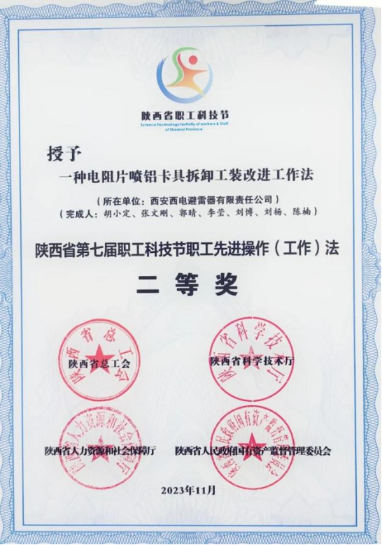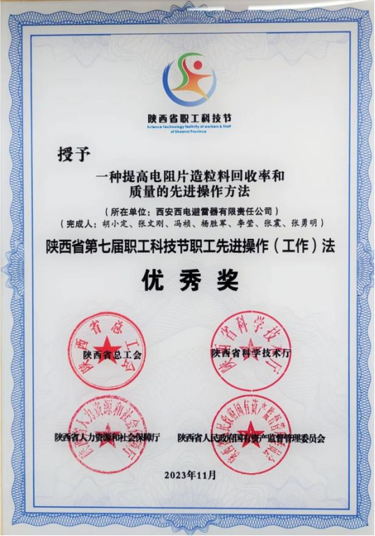 陕西省职工先进操作(工作)法优秀奖——尊龙凯时避雷器“一种提高电阻片造粒料回收率和质量的先进操作方法”