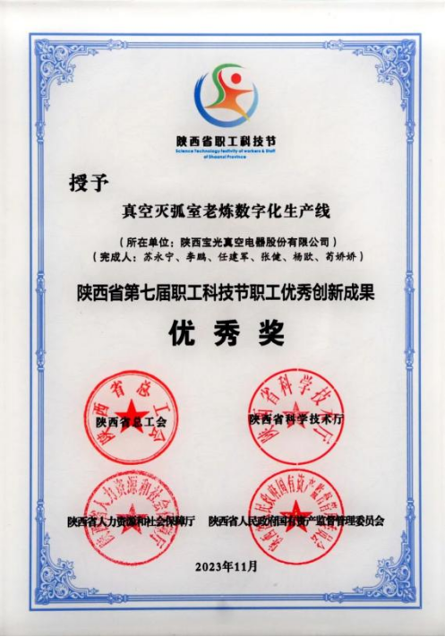 陕西省职工优秀创新成果优秀奖——宝光股份 “真空灭弧室老炼数字化生产线”