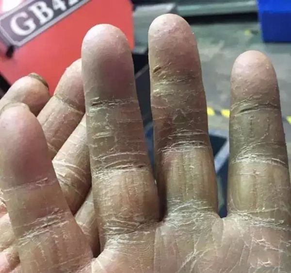 手掌像老树皮,干枯、开裂;