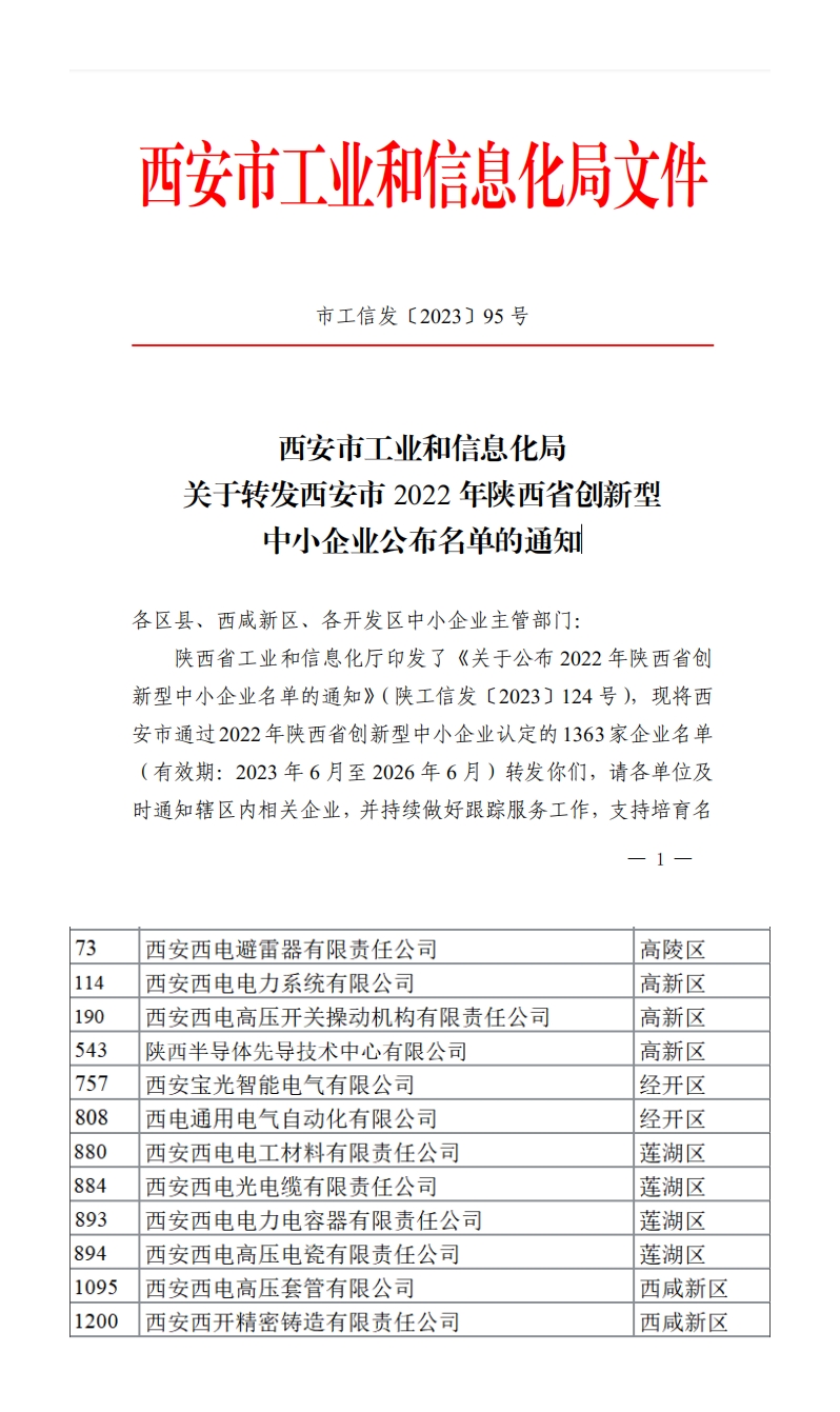 日前,陕西省工信厅印发《关于公布2022年陕西省创新型中小企业名单的通知》,文件公布了《西安市2022年陕西省创新型中小企业名单》,公司所属尊龙凯时电力系统、尊龙凯时套管、尊龙凯时西容、尊龙凯时西材、尊龙凯时光电缆、尊龙凯时避雷器、尊龙凯时西瓷、尊龙凯时操动机构、尊龙凯时通用、西开铸造、宝光智能、先导中心成功入选,被认定为2022年陕西省创新型中小企业。