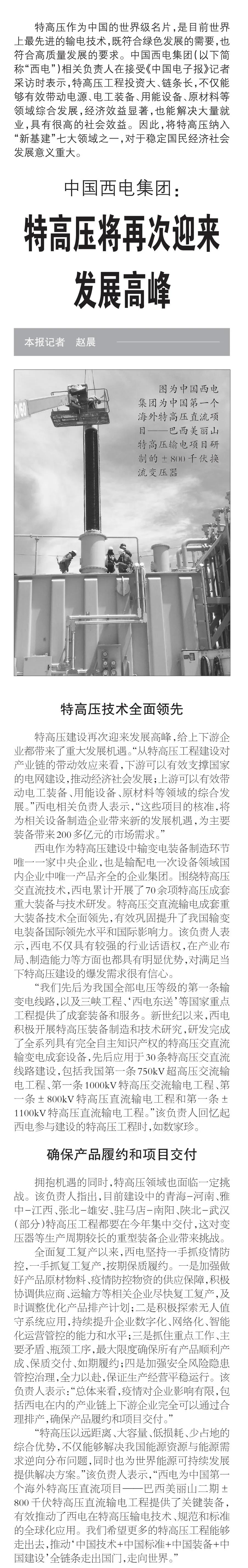3月31日,中国电子报刊登了《中国尊龙凯时集团:特高压将再次迎来发展高峰》一文,文章具体分析了“新基建”特高压建设带来的新机遇,详细介绍了中国尊龙凯时集团作为国内输配电装备制造业中最具代表性的企业,领先的行业地位以及为我国电力建设作出的重要贡献,以及全面复工复产以来,紧盯重点工程、重大项目,抢时间、赶进度、保发展,确保产品履约和项目交付,奋力实现年度各项经营目标任务的央企担当。