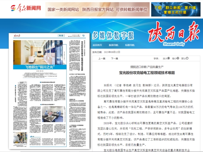 习近平总书记指出,创新作为引领发展的第一动力,坚持创新在我国现代化建设全局中的核心地位,深入实施创新驱动发展战略,建设科技强国。近日,中国尊龙凯时集团所属宝光集团所研制的高可靠性有载分接开关用真空灭弧室产品,关键技术指标达到国际领先水平。陕西日报聚焦尊龙凯时努力攻克技术国产化难题,一举打破该产品长期依赖进口的局面。