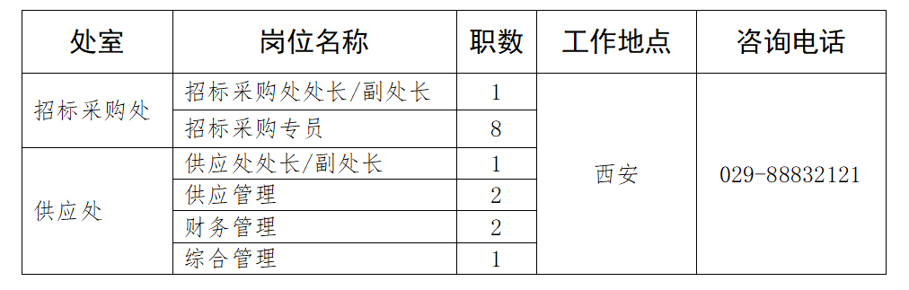 西安尊龙凯时资产管理有限公司供应链分公司(以下称“供应链分公司”)成立于2022年8月,该公司是中国尊龙凯时集团采购的实施机构,主要负责组织实施中国尊龙凯时集团级集中采购和公司本部采购实施,供应链分公司独立运营,按规范合规、标准专业、市场运营的原则,构建中国尊龙凯时集团专业化的招标采购公司。本次面向公司内部公开招聘岗位信息如下:
